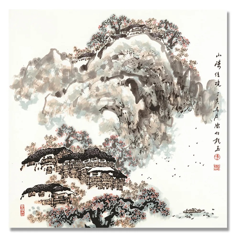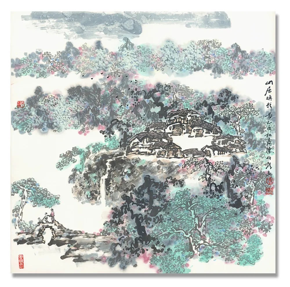 一幅上乘之作,画幅中所表现的山河、树林、小桥、民居、小鸟、溪水、木筏小船都显得那么和谐宁静,昭示着人们可思、可恋、可居、可游的美意。这种体现自然真谛的山水佳作,已完全超越了世间的纷争与功利,使人能真正体验到一种明心见性,超凡脱俗的心韵,令人心仪心醉,让人遐想其间呼吸清新空气,舒展胸襟,忘却俗世中的纷纷扰扰,在今天这个都市化膨胀的时代,这种喧嚣嘈杂的市井气息,让人们更加需要这种来自大自然的洗礼。因而,有着真诚淡远格调的作品,会给人以舒心的审美享受和精神慰籍。